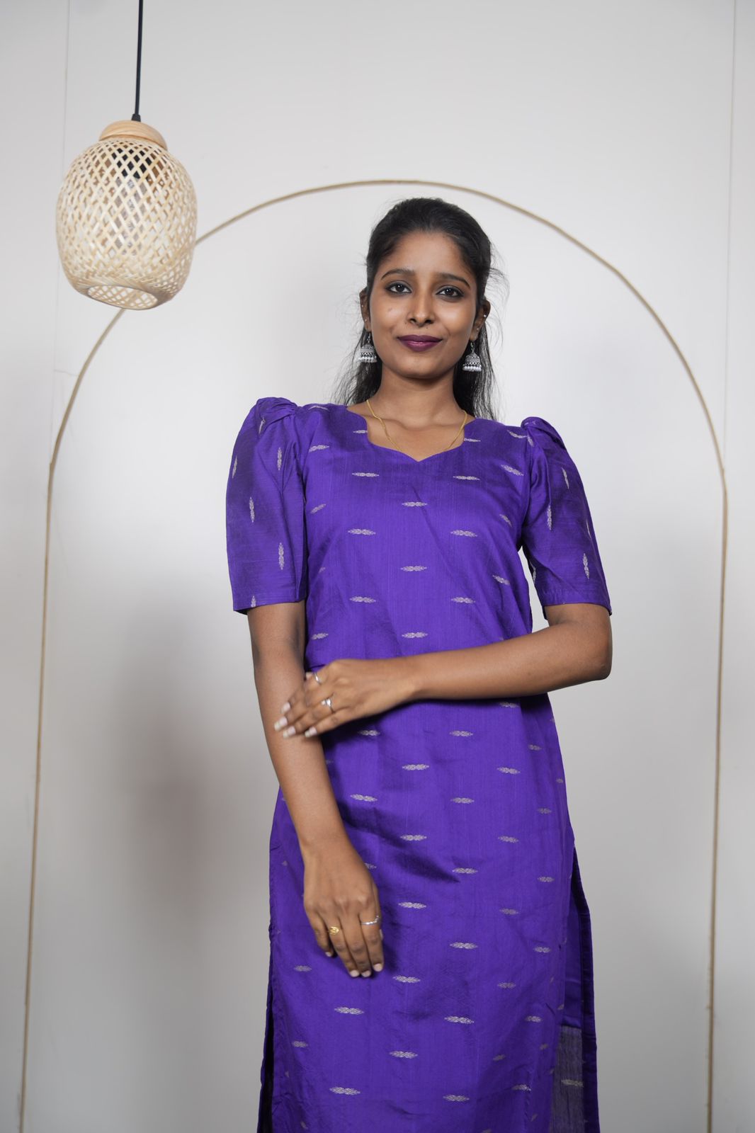 A gorgeous royal blue raw silk kurti with subtle woven motifs, finished with a classy notched neckline and puff sleeves — a...